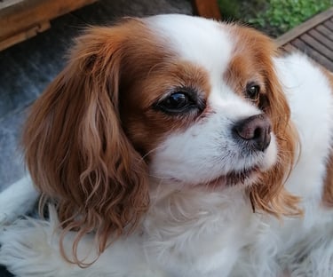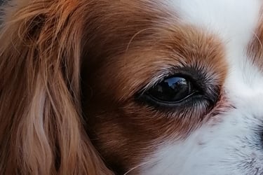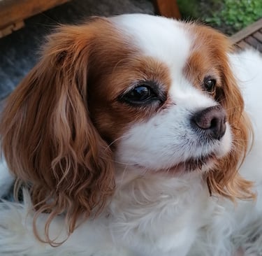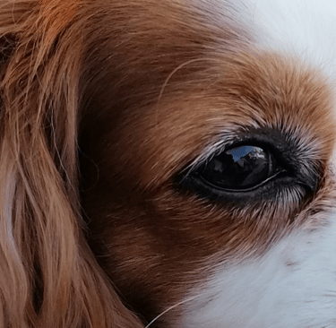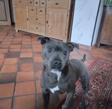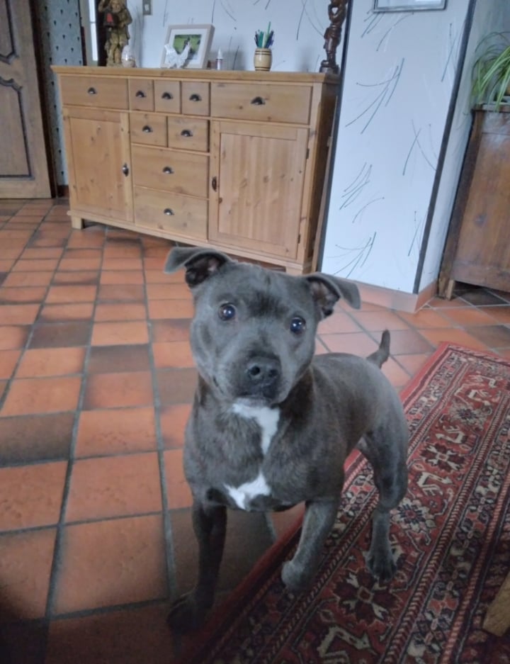 Exemple de photo difficile à travailler : on voit sans même zoomer que la photo est un peu floue. On ne voit pas la couleur des yeux du chien (ils sont marron ! ) et les ombres et lumières sont peu marquées du fait de la prise de vue en intérieur.